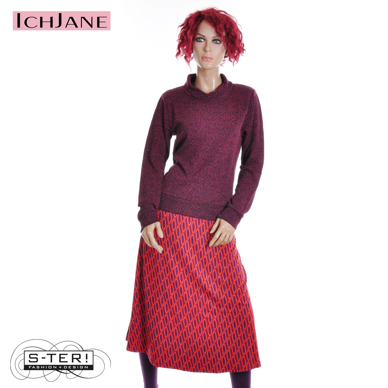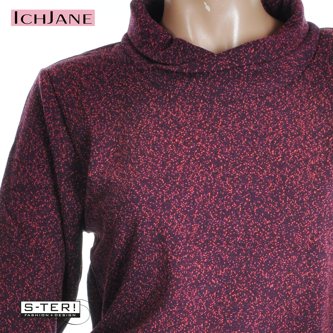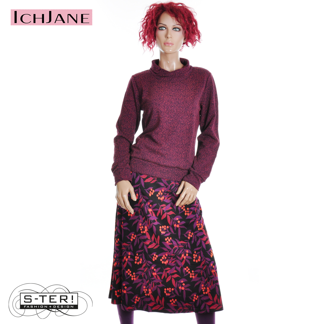 Ich Jane komt uit Berlijn en is een klein merk dat ook in Berlijn handgemaakt wordt. Deze fijne sweater heeft een colletje en boorden bij de mouwen en zoom en is gemaakt van zachte warme jacquard stof met stretch in donker paars met oranje stipjes. Er zijn ook bijpassende rokken in deze stof.