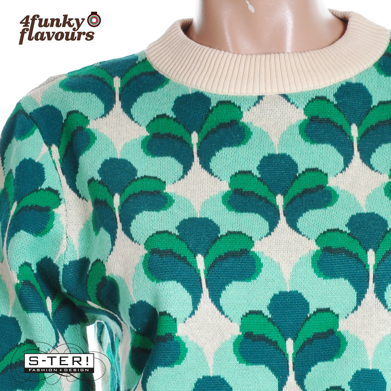 Deze mooie trui heeft een te gek patroon en is een iets wijd model met wijd uitlopende pof mouwen met strakke boordjes bij de pols. Het is gemaakt van zachte gebreide katoen.