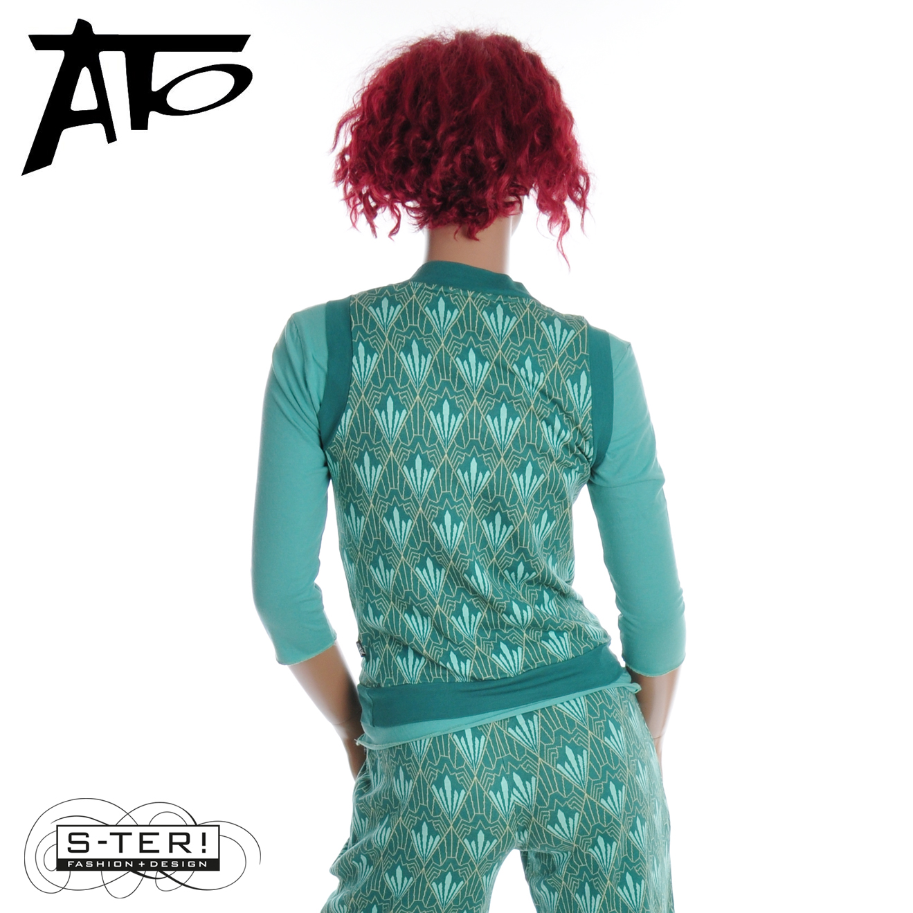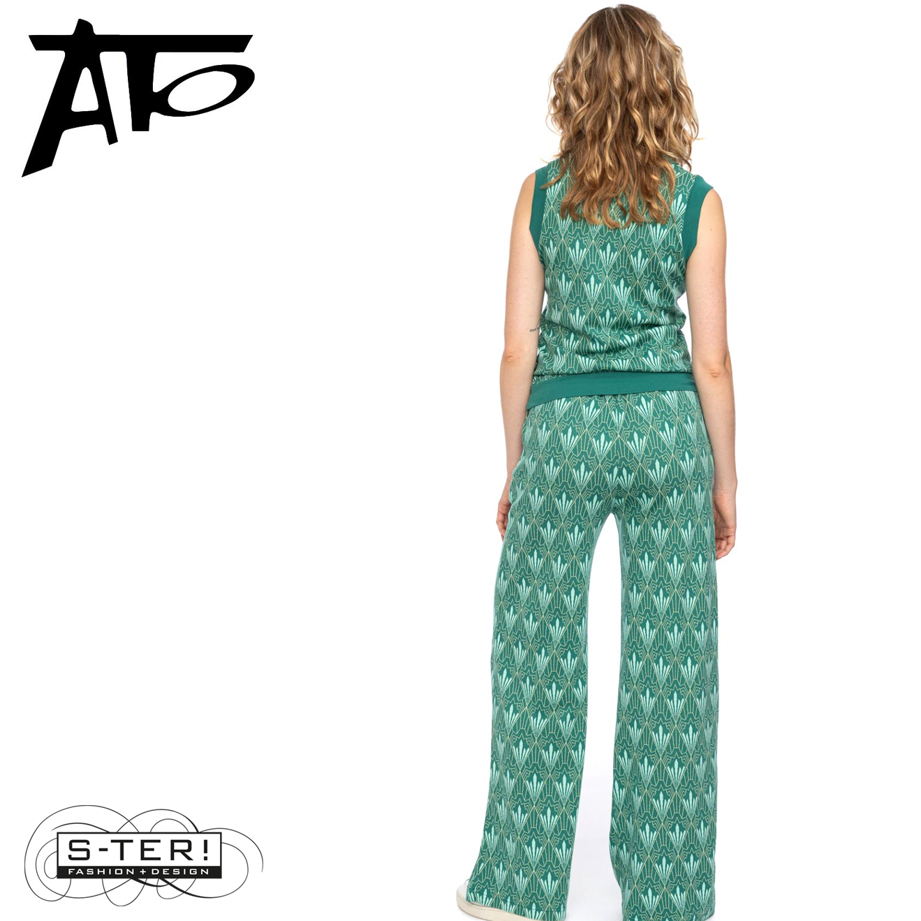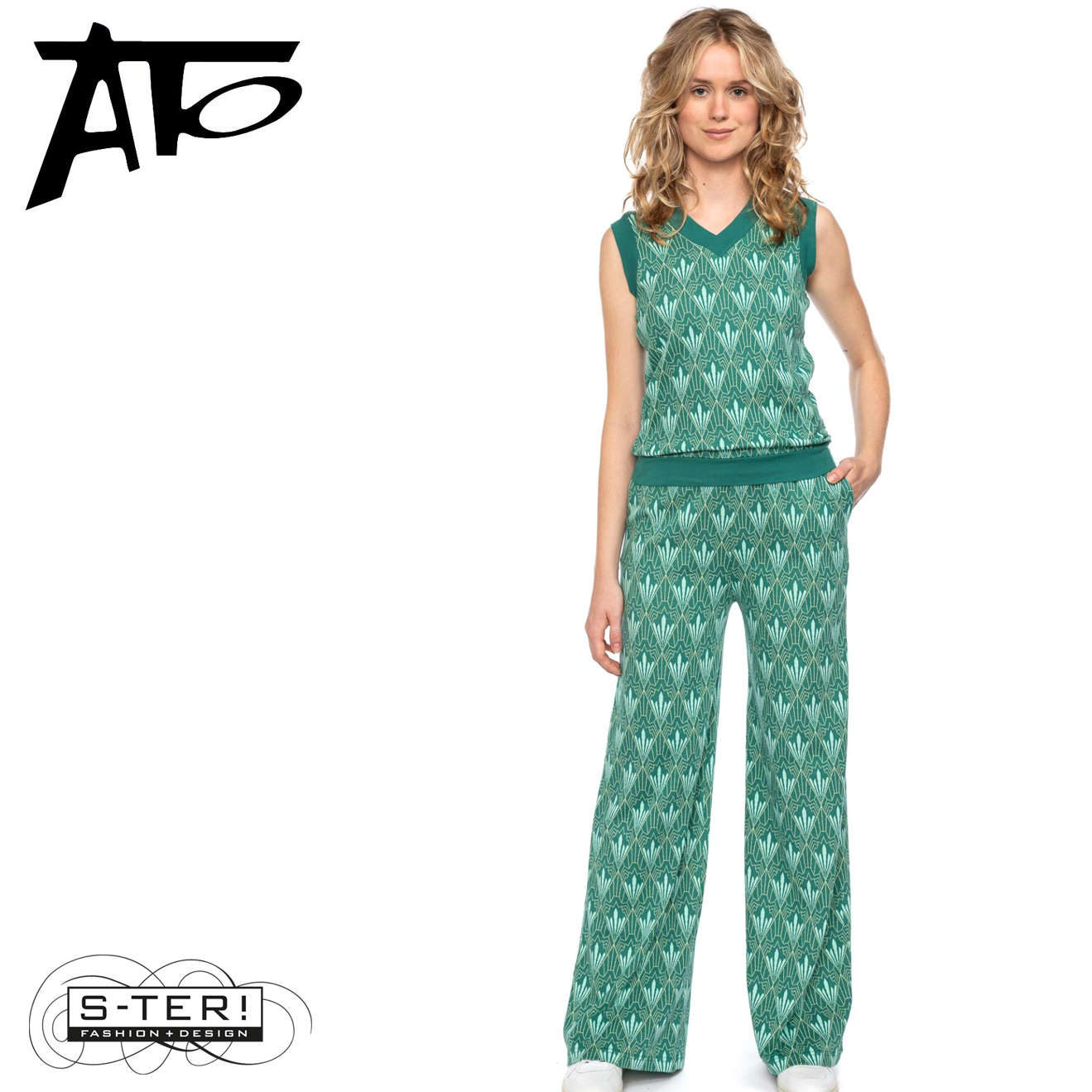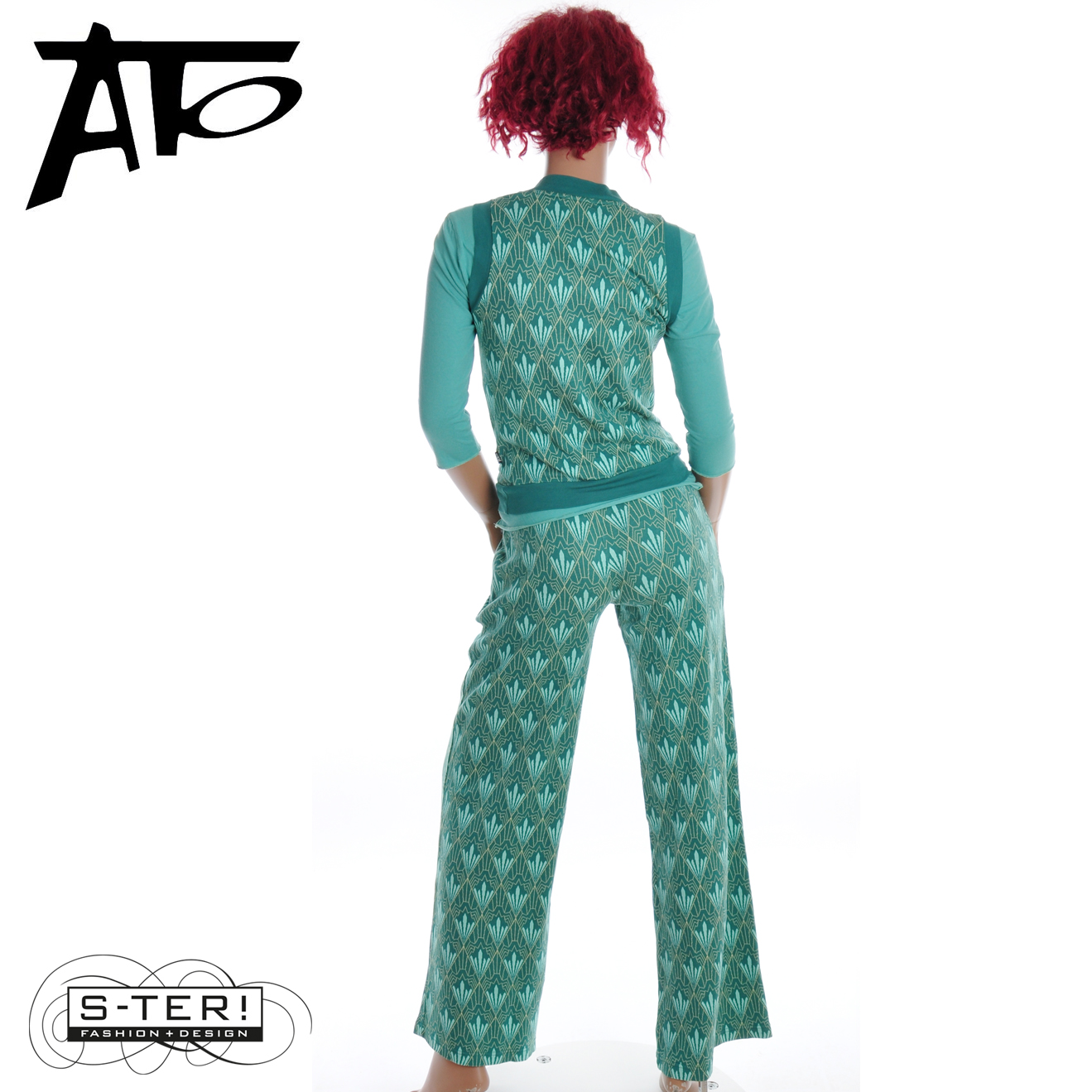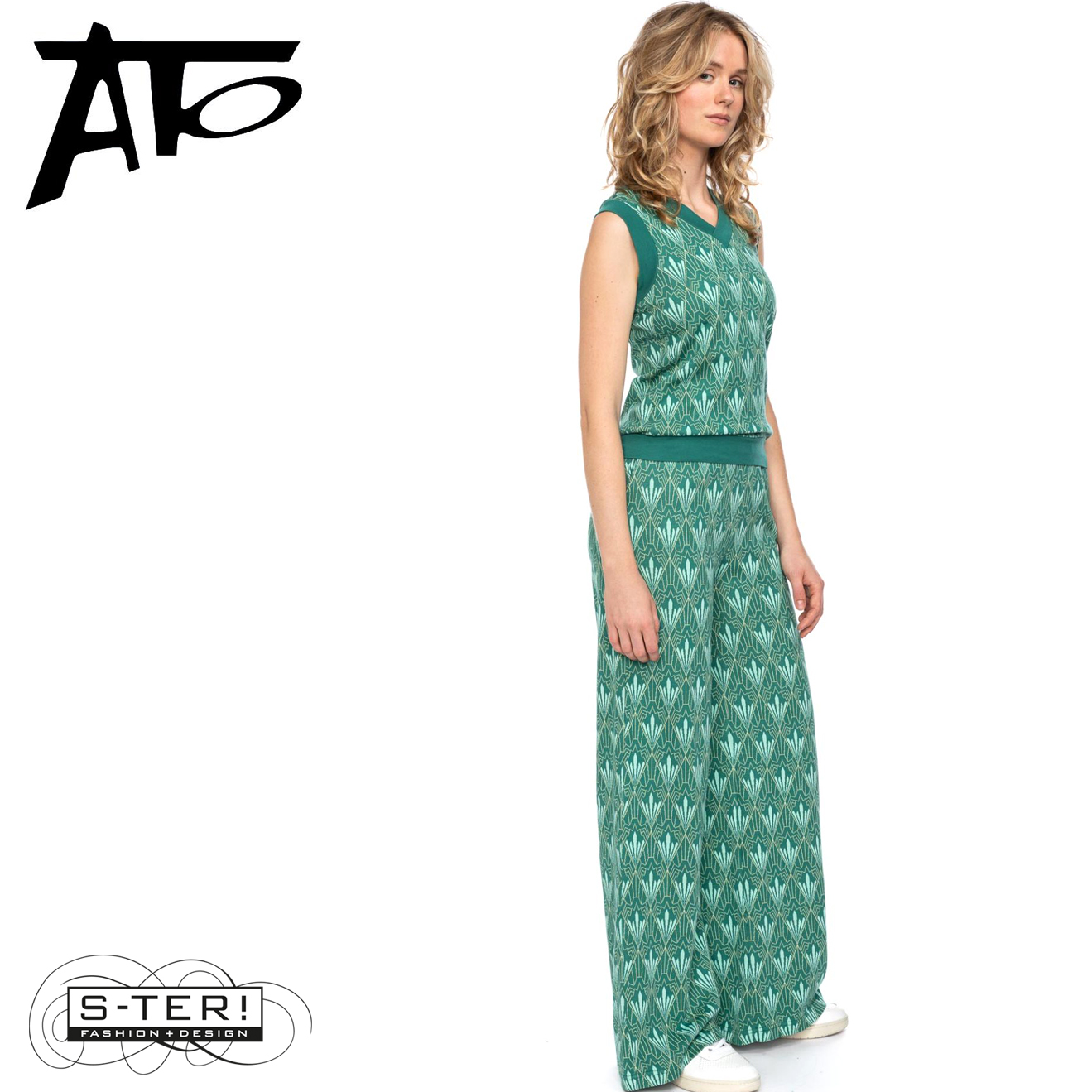 Dit fijne spencer heeft een mooi grafisch patroon en heeft een V hals en boordjes bij hals, armgat en zoom. Hij is gemaakt van rekbare jaquard en er is ook een broek in deze stof.