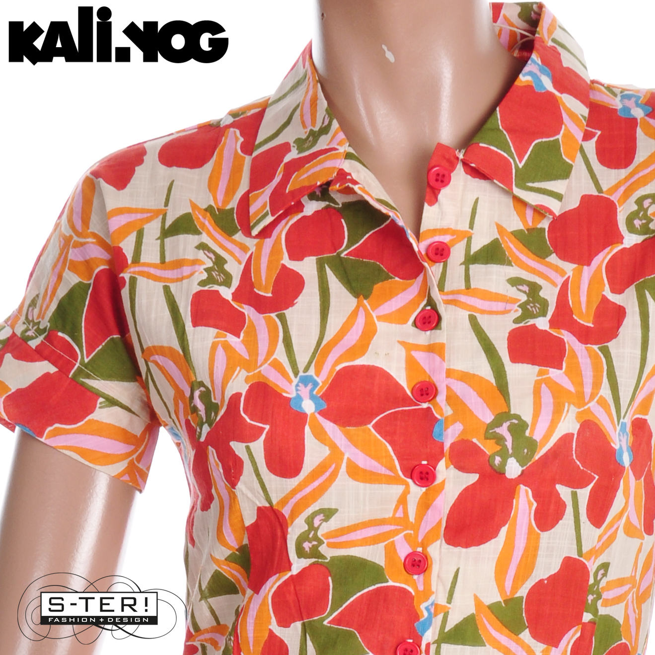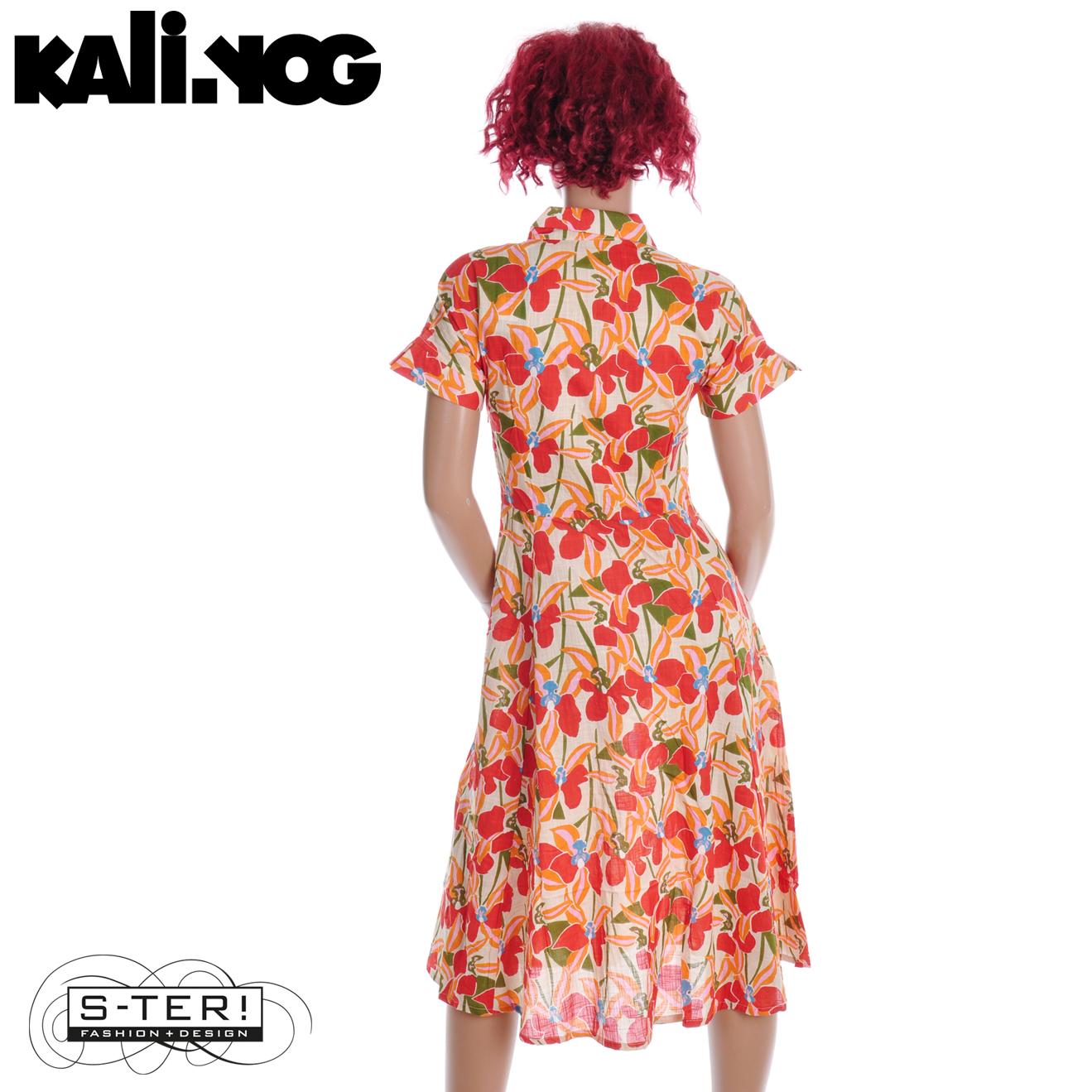 Kali-yog is een nieuw merk uit Frankrijk. Een beetje hippie style en alles gemaakt van bio katoen en geproduceerd in India op een verantwoorde manier in klein atelier. Deze mooie jurk is een heel elegant model met kraagje, knoopsluiting, steekzakken en korte mouwen. Het heeft een mooi aansluitend lijfje en wijd uitlopende KLOKrok EN MOOIE print. Het is gemaakt van hele dunne geweven katoen zonder stretch.