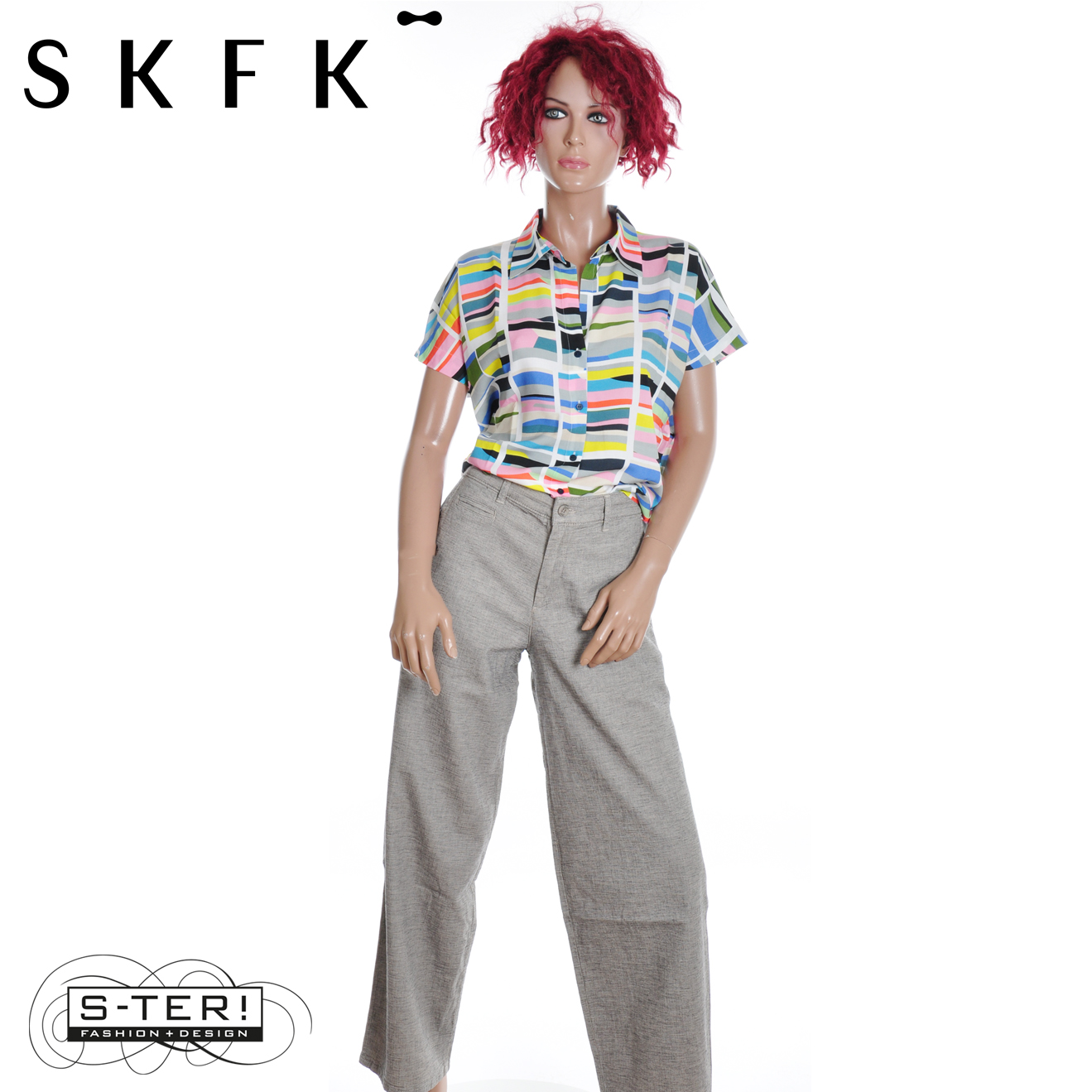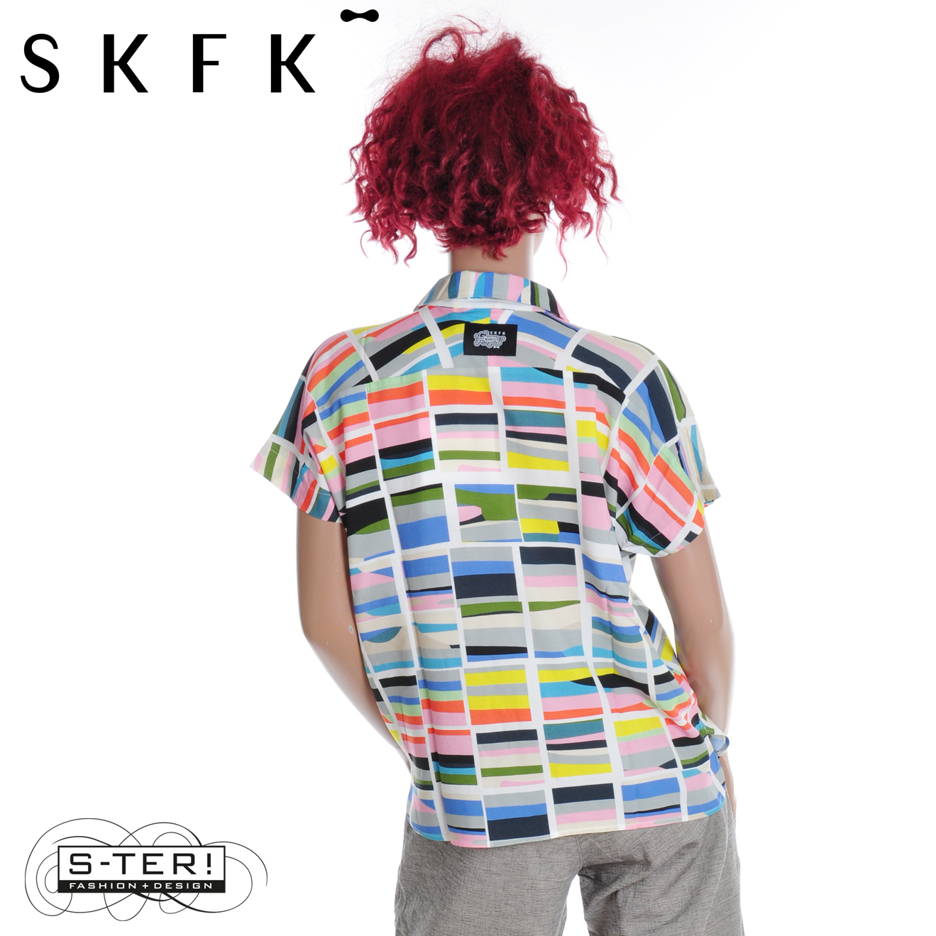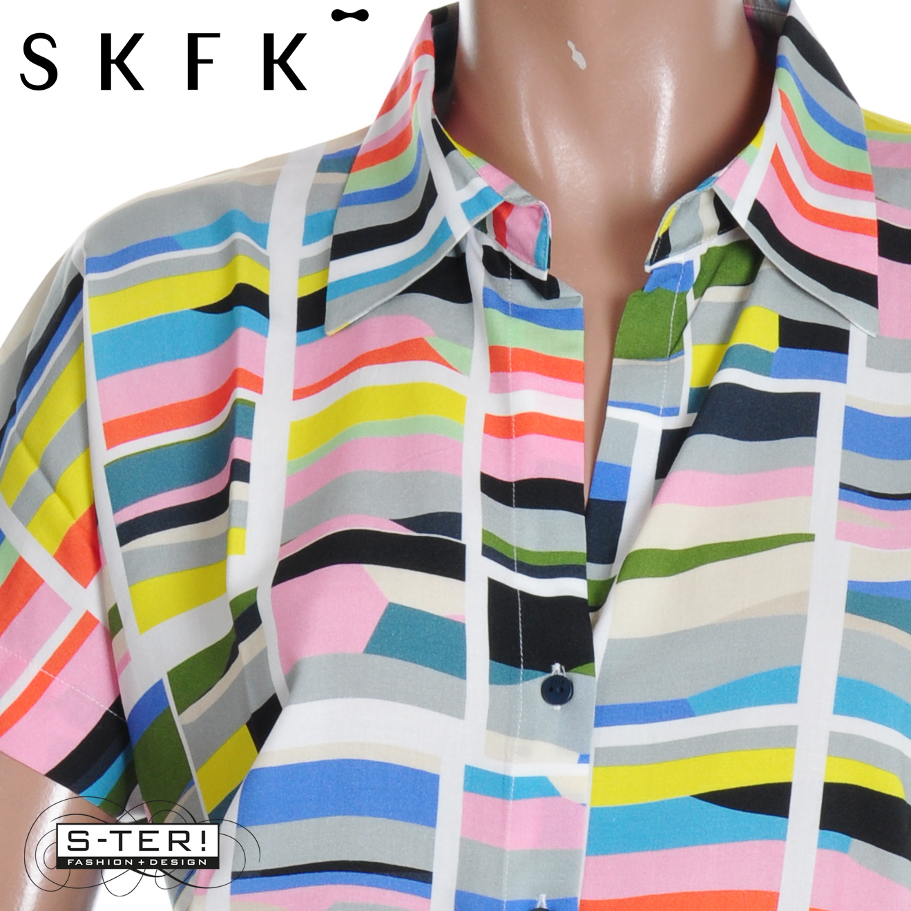 Deze leuke blouse is een lekker los model met revers kraag en knoop sluiting en aangeknipte mouwen. Het dessin is ontworpen door kunstenaars GREMS waar SKFK vaak mee werkt. Het is gemaakt van geweven eco vero viscose.