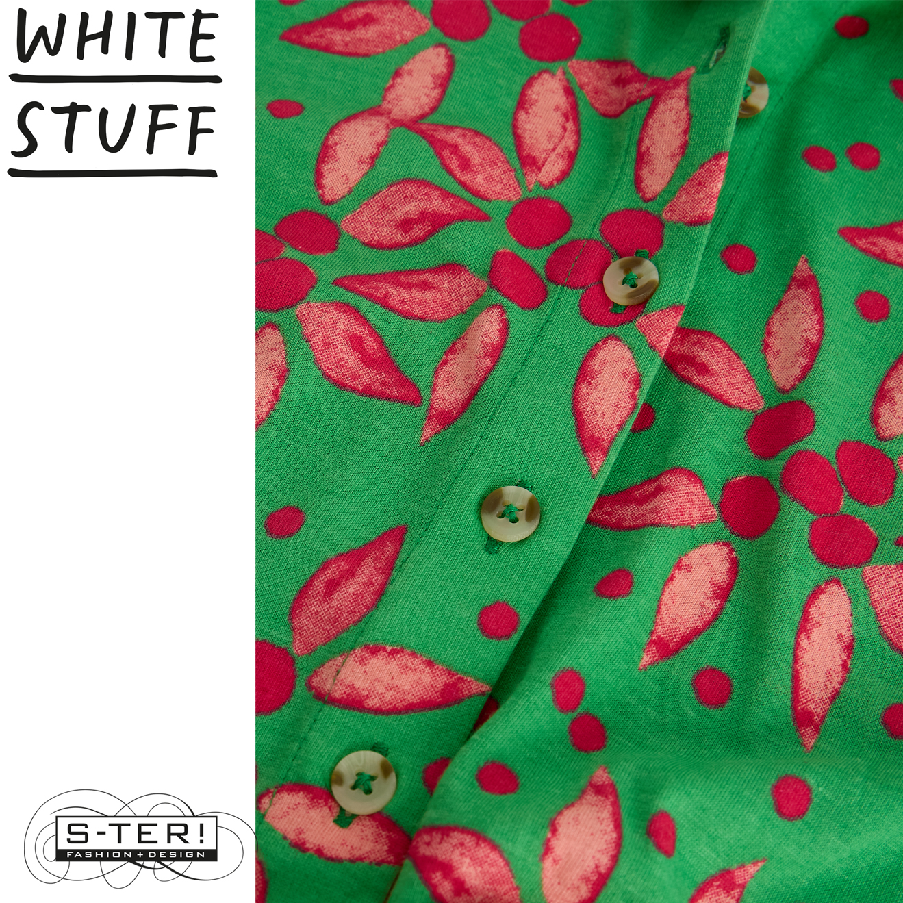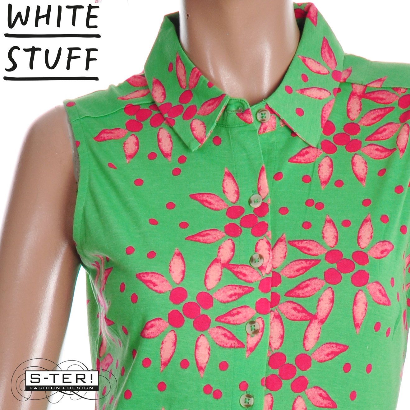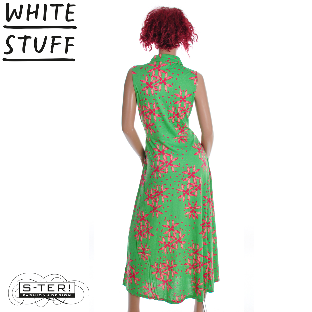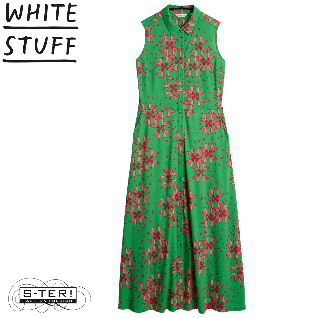 Deze jurk is een van de bekendste modellen van White Stuff. Deze lange variant is mouwloos en heeft een kraagje, knoop sluiting en steekzakken en is gemaakt van zachte rekbare stof met mooie print.