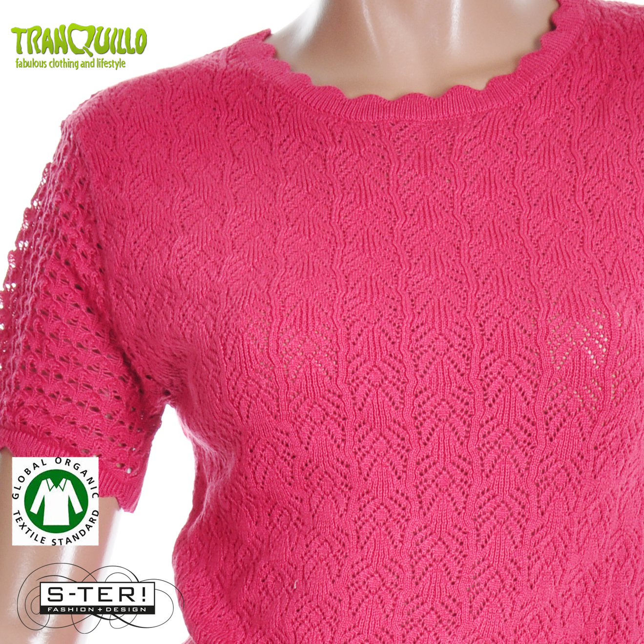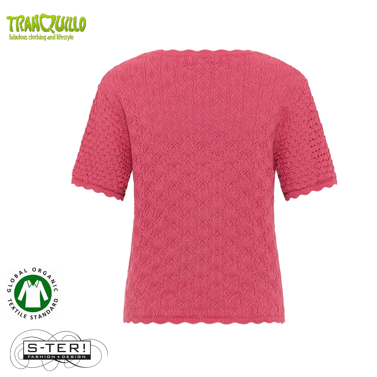 Dit mooie topje heeft een ronde hals en korte mouwen met mooie sier randjes en is gemaakt van gebreide KATOEN met mooi ajourpatroon.