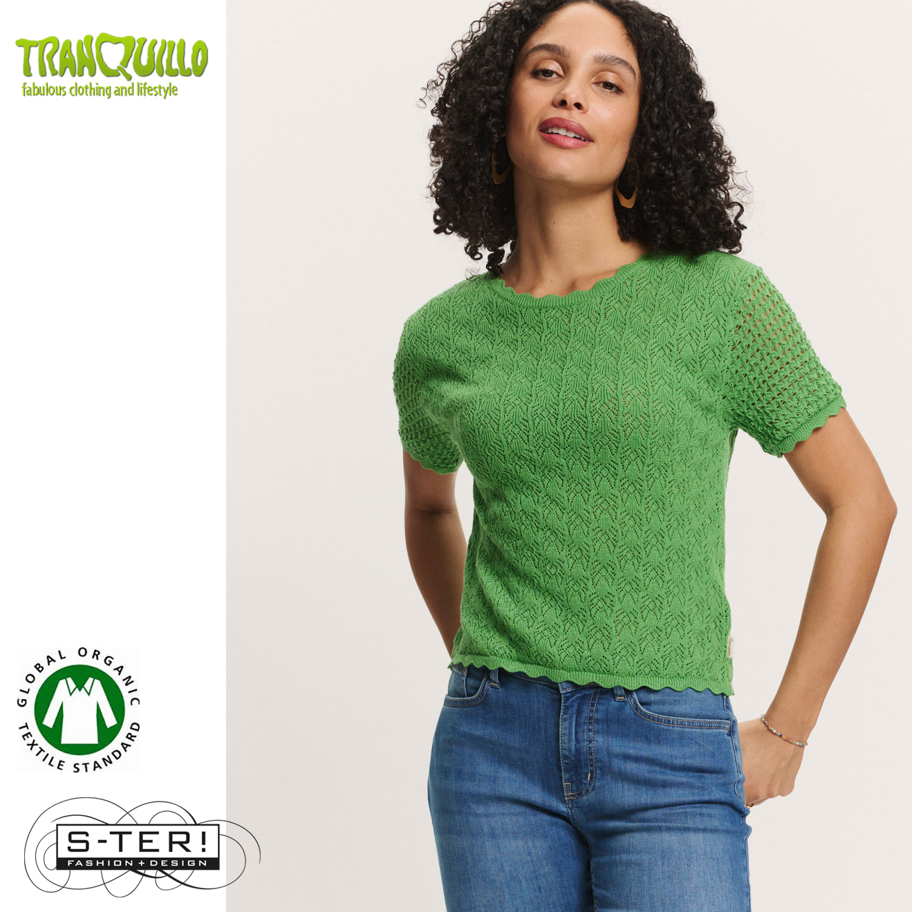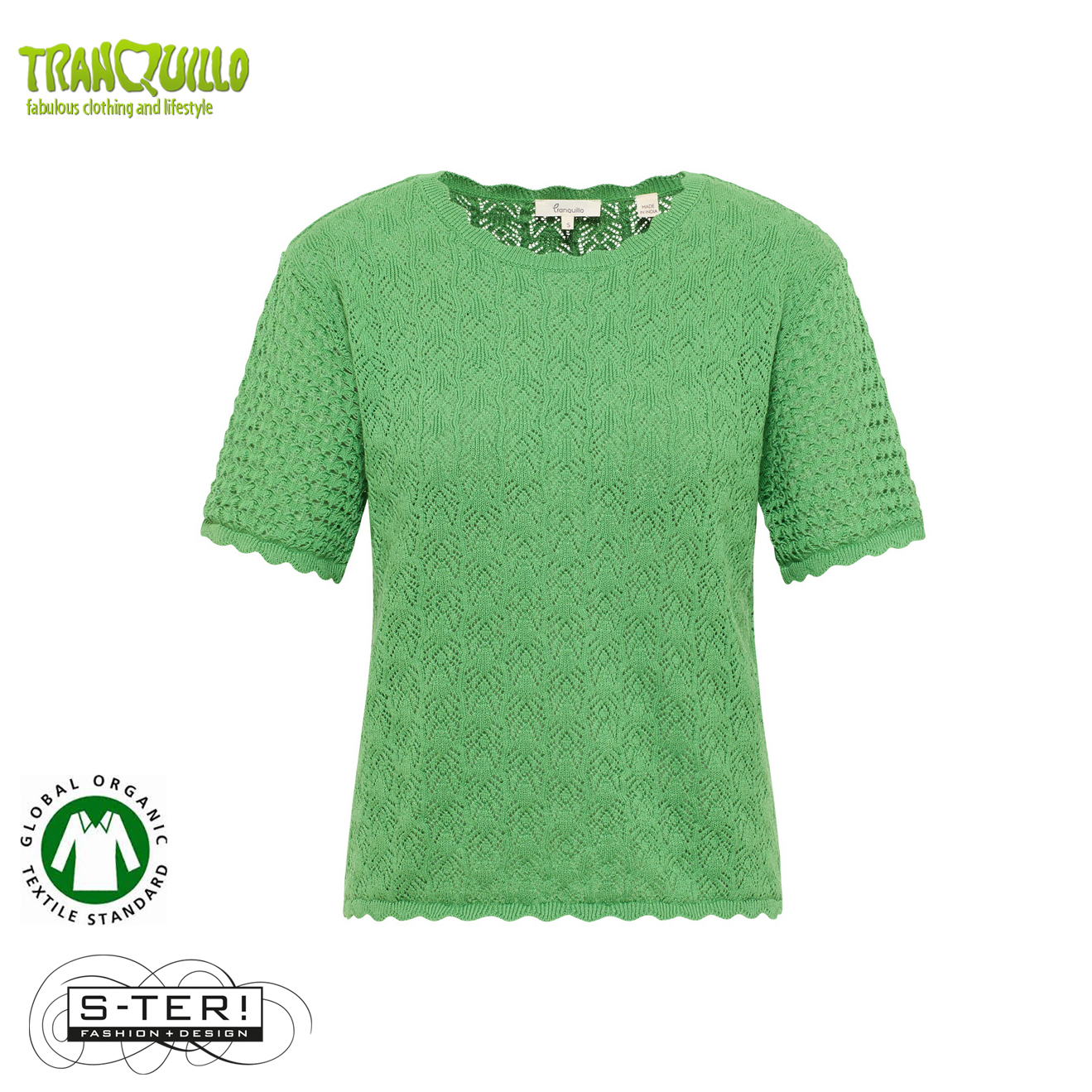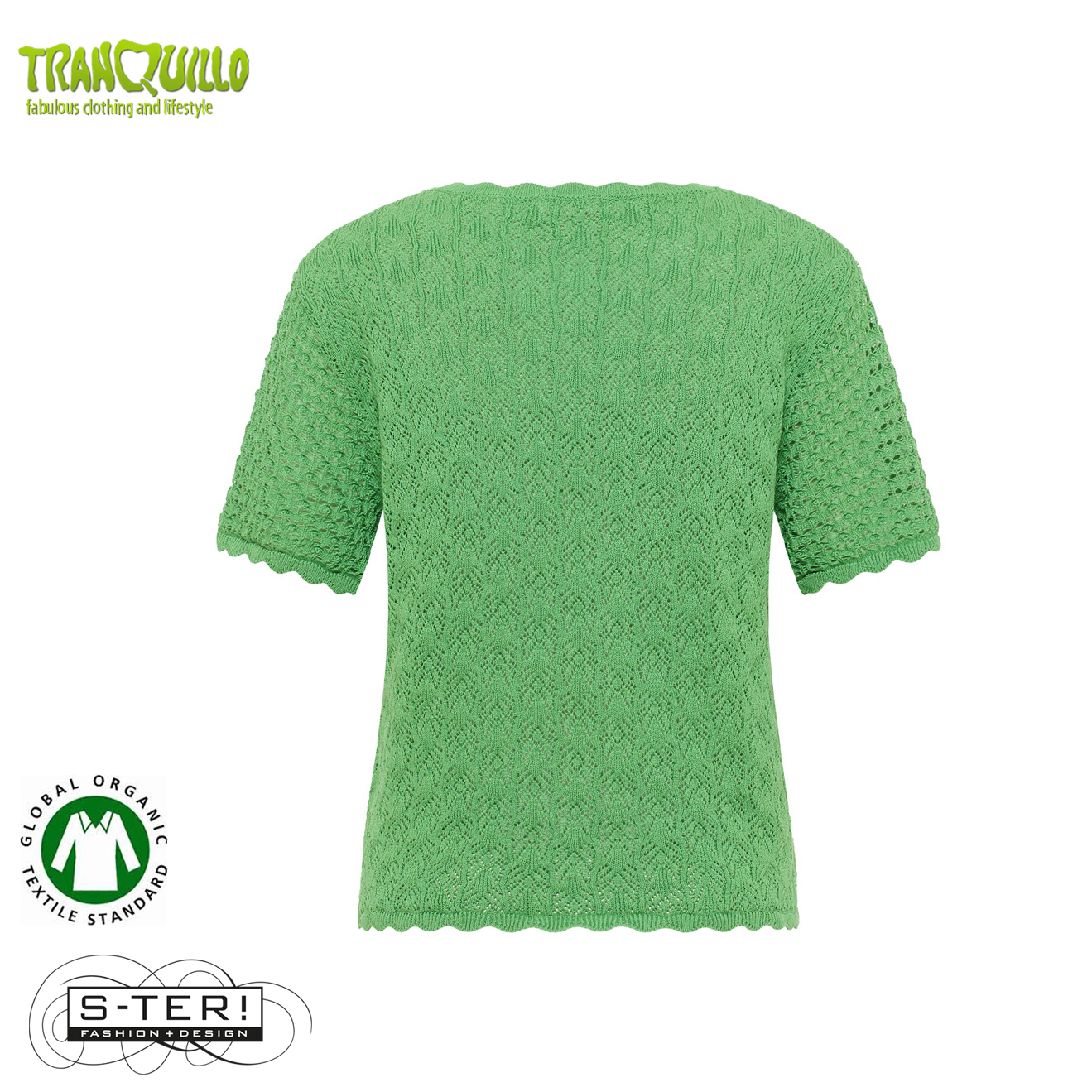 Dit mooie topje heeft een ronde hals en korte mouwen met mooie sier randjes en is gemaakt van gebreide KATOEN met mooi ajourpatroon.