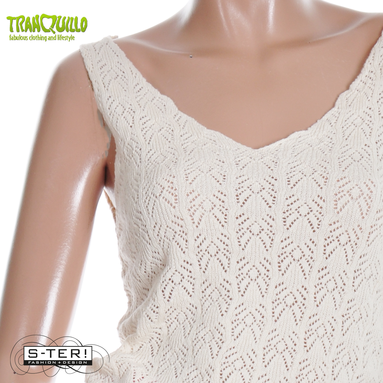Dit mooie topje heeft een V hals en smalle schouderbandjes met mooie sier randjes en is gemaakt van gebreide KATOEN met mooi ajourpatroon.