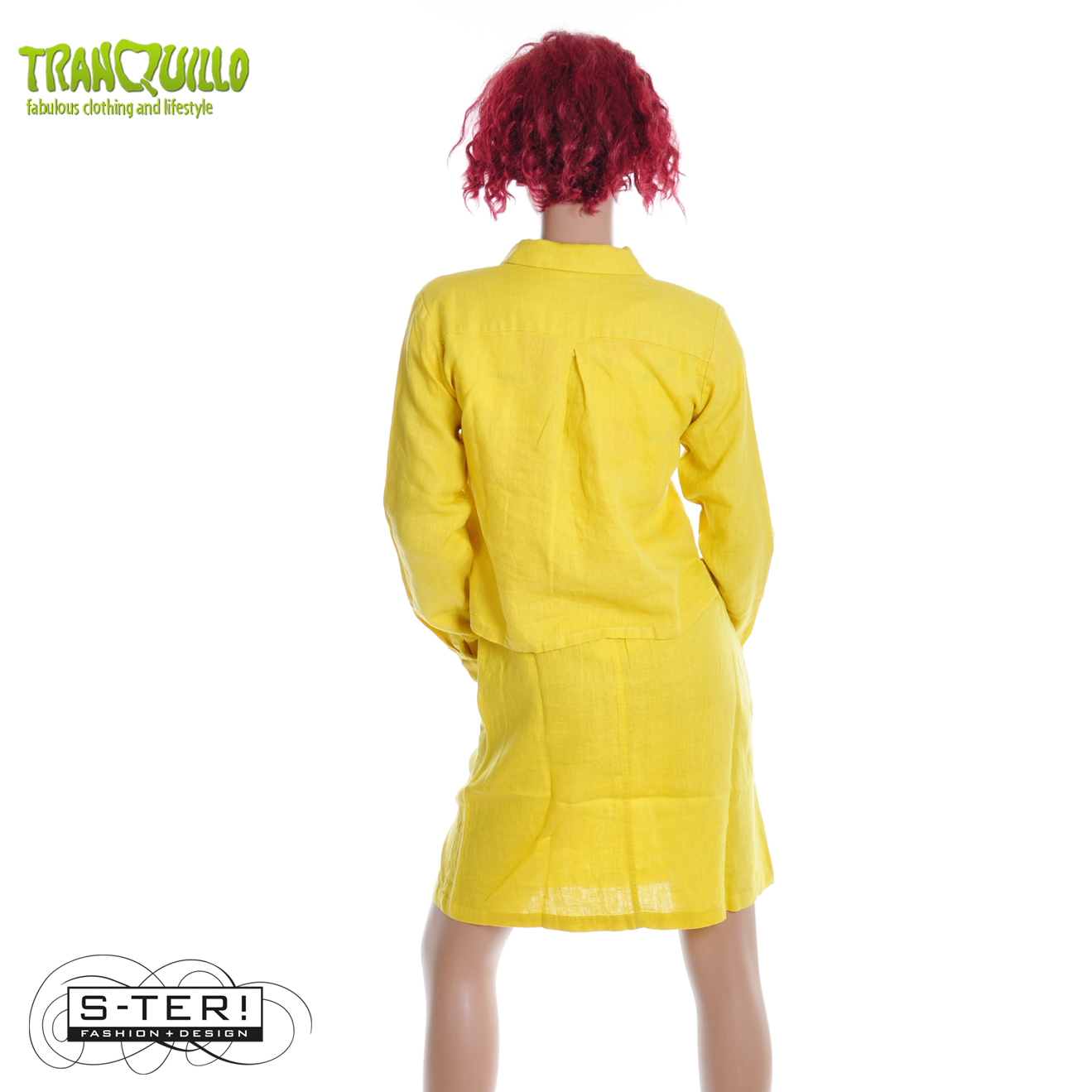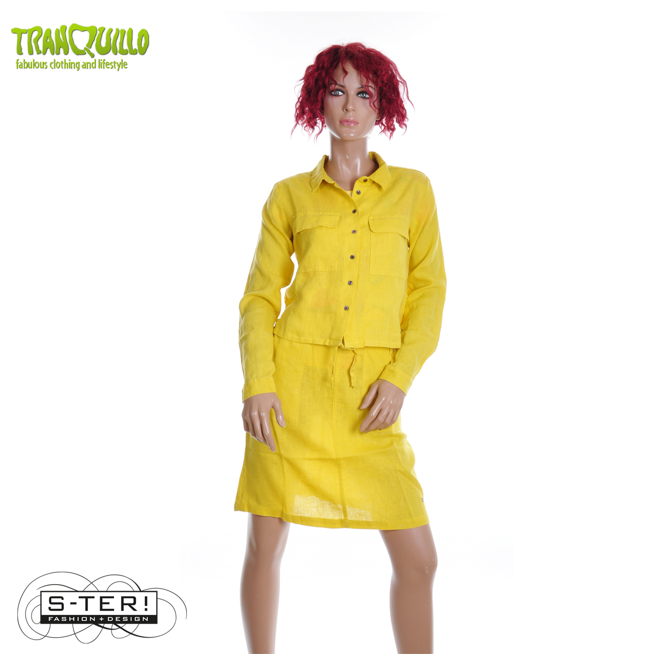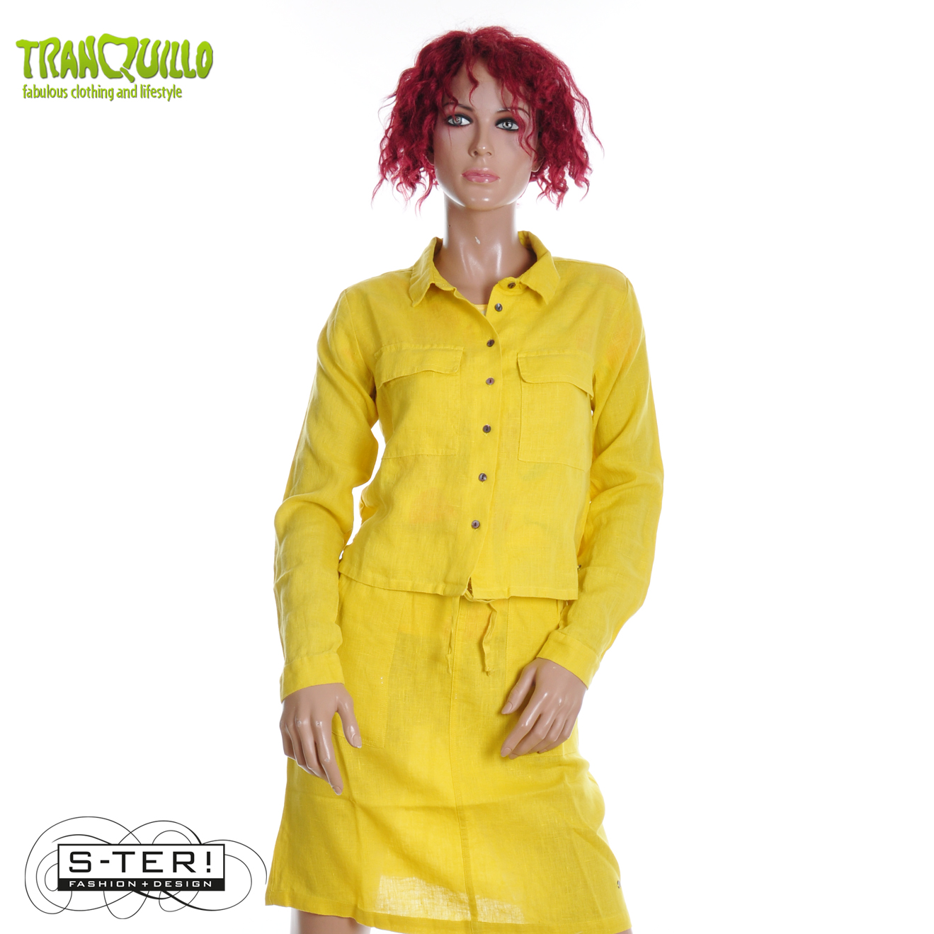 Dit mooie blousje of jasje is een boxy model met kraagje en knoopsluiting en grote zakken op de borst. Het is gemaakt van geweven linnen. Er is ook een bijpassend rokje.