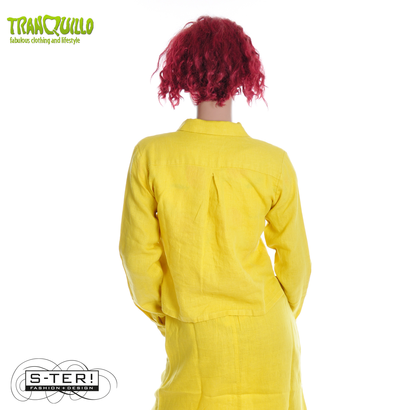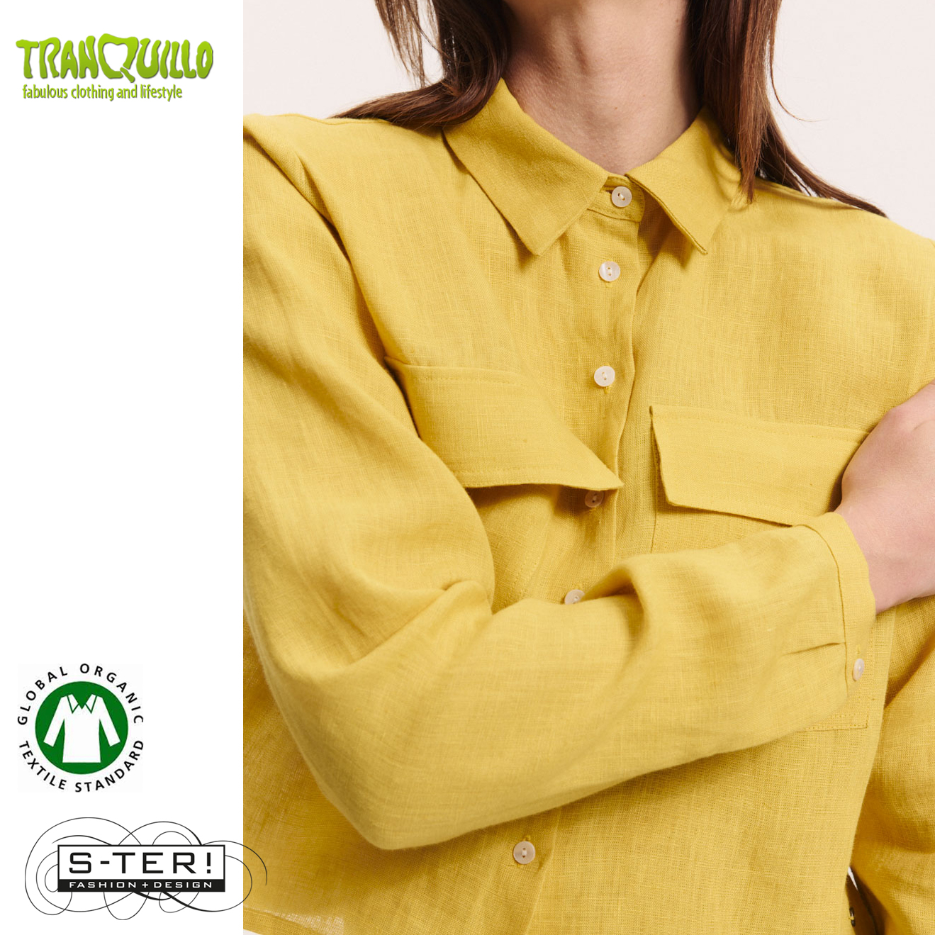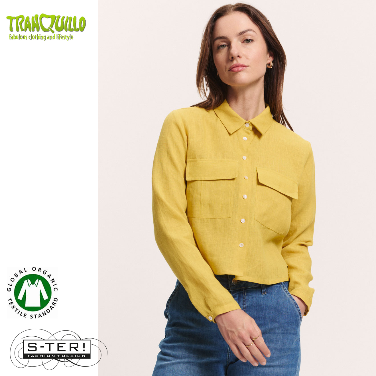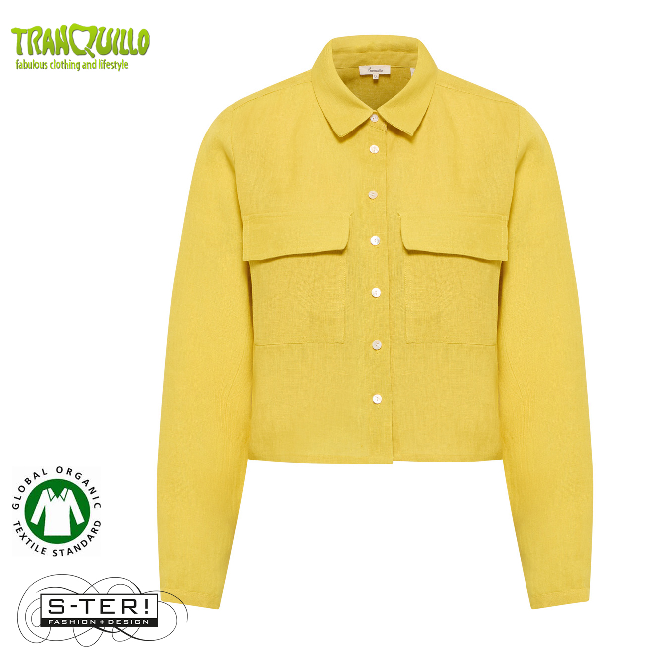 Dit mooie blousje of jasje is een boxy model met kraagje en knoopsluiting en grote zakken op de borst. Het is gemaakt van geweven linnen. Er is ook een bijpassend rokje.