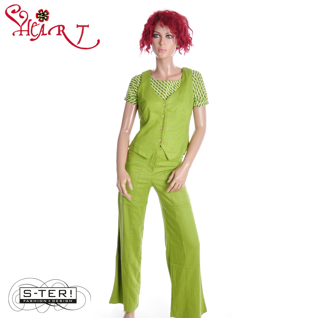 Deze broek zit heerlijk en is een model met vrij rechte wijde pijpen, het heeft geen strakke tailleband waardoor ze heel ruim in de maten zijn en heerlijk zitten. Ze hebben grote zakken achterop en voor. Deze is van zachte linnen-katoen mix gemaakt. Bij deze is er ook een bijpassend gilet.