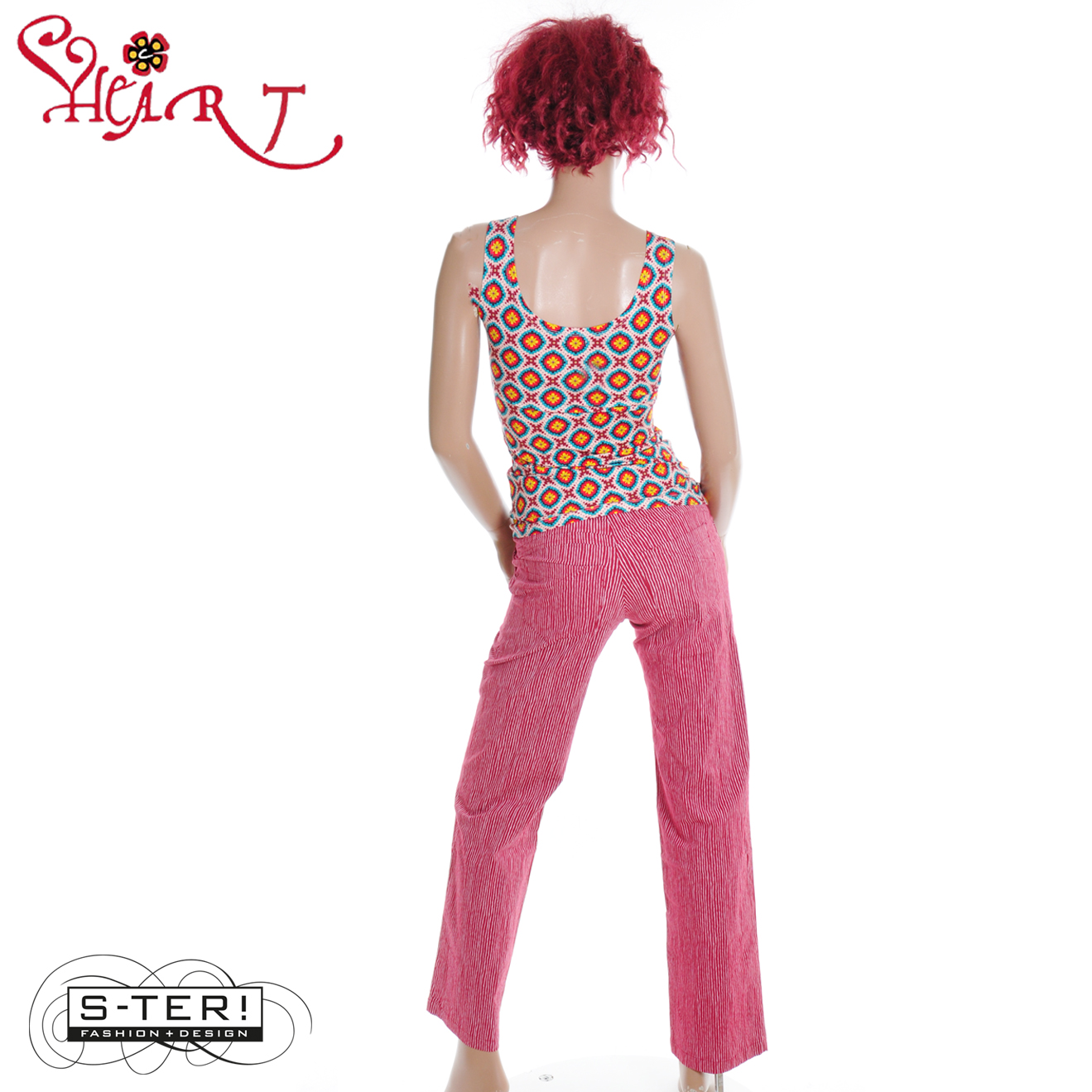 Dit shirt is mouwloos en lekker zomers. Deze is van zachte rekbare jersey gemaakt met leuk “gehaakt” dessin. Er is ook een bijpassende rok die erbij het geheel uit laat zien als jurkje.