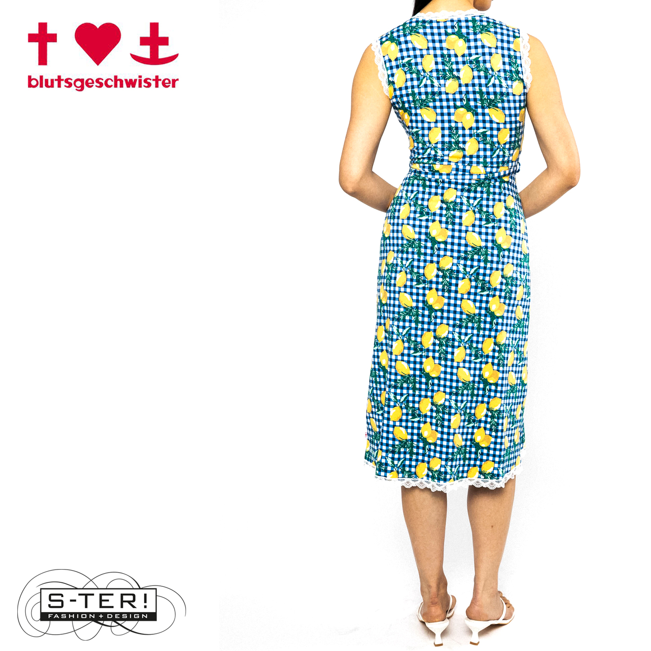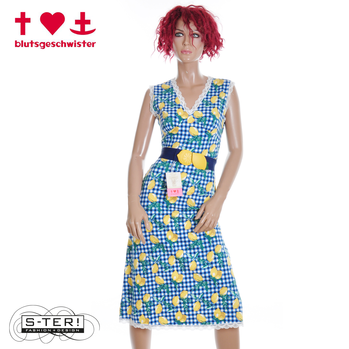 Deze leuke jurk heeft een gave citroenen-ruiten print. Het heeft een diepe V hals en strikbandje in de taille en is een mooi getailleerd model gemaakt van zachte rekbare jersey.