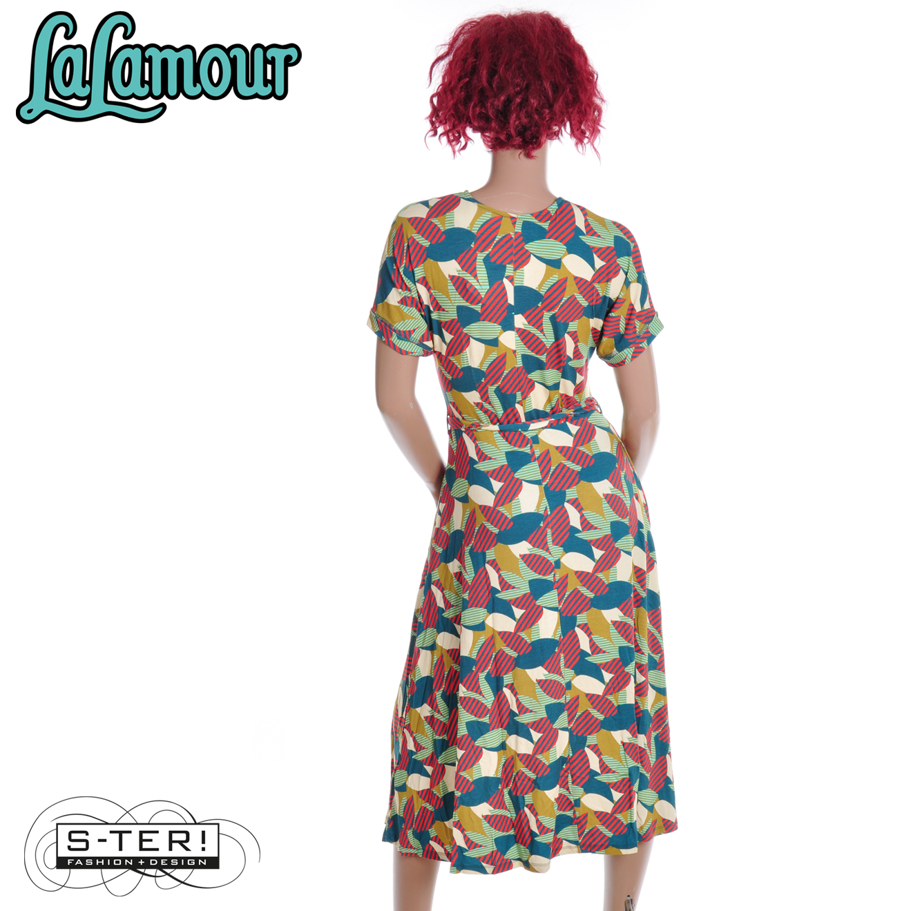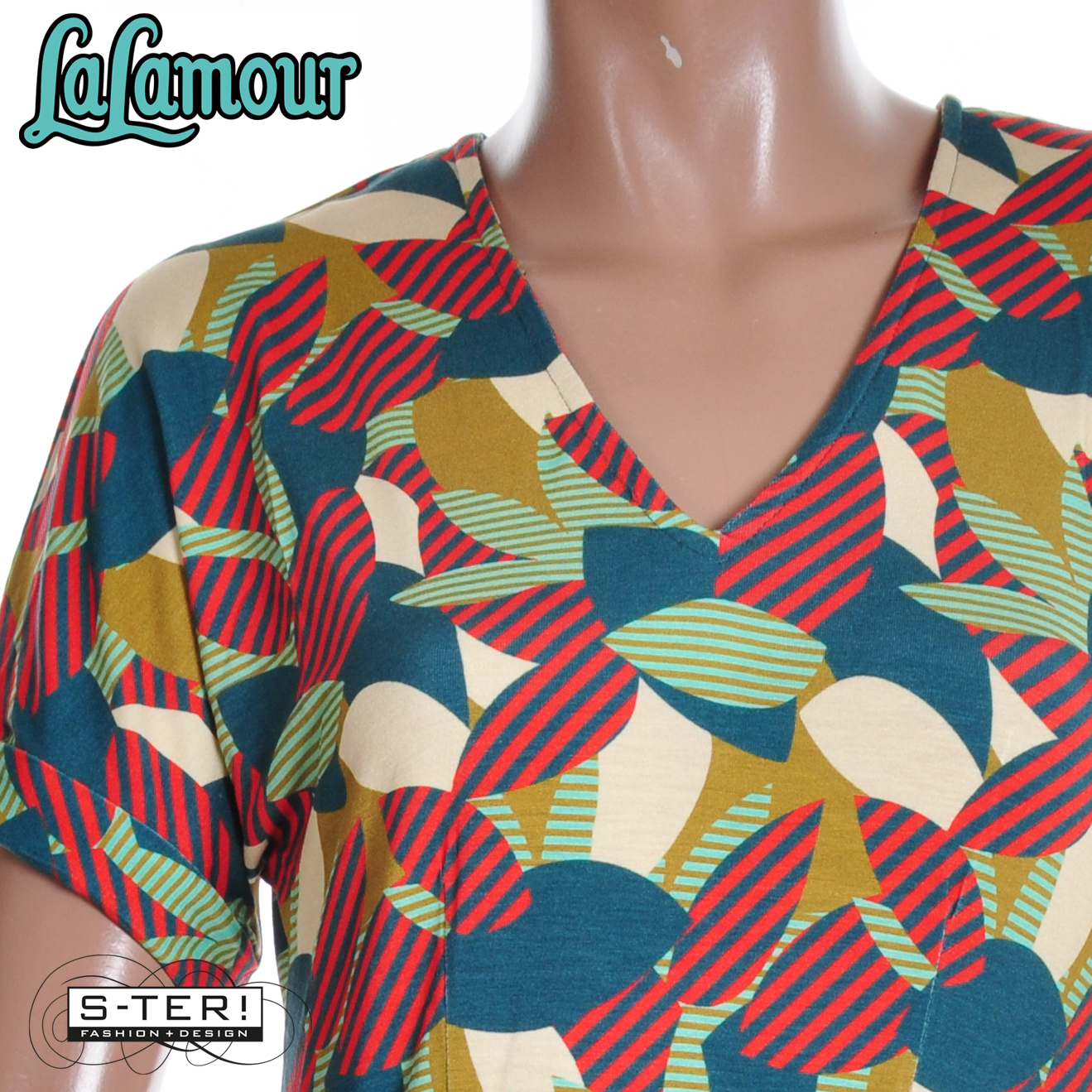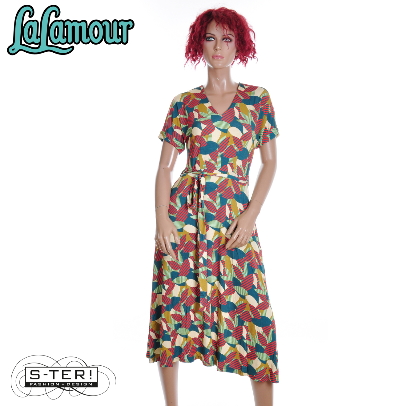 Deze mooie jurk heeft een V hals, strikband in de taille en aangeknipte korte mouwen en is een mooi model dat bovenaan aansluit maar vanaf de taille wijd uitloopt. Het is gemaakt van zachte rekbare tricot. Deze heeft een mooie grafische print in warme kleuren.