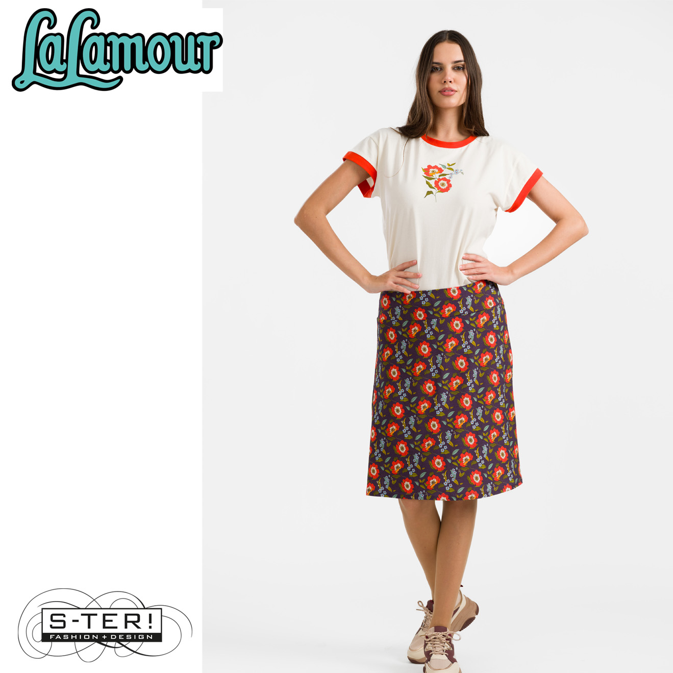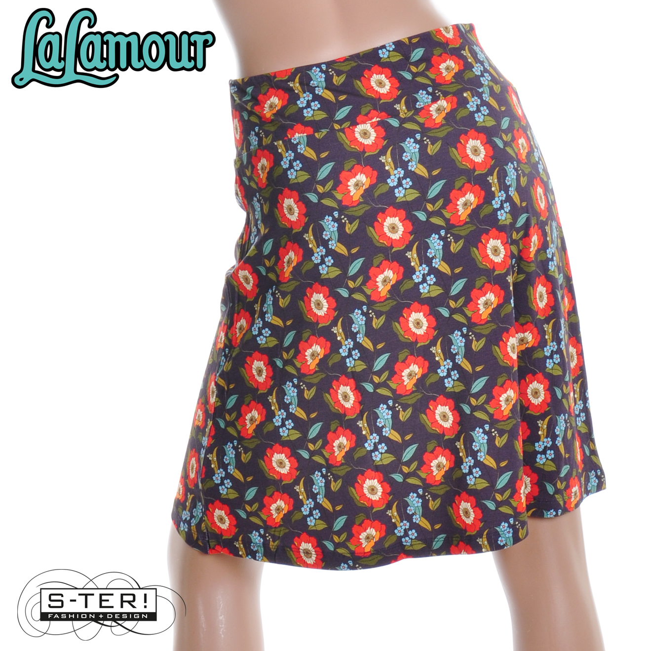 Dit rokje is een bekend model met brede tailleband en iets A-lijn model. Het is gemaakt van zachte rekbare tricot. Deze heeft een mooie print met klaproosjes. Draag er het leuke T-shirt bij met de bloem opdruk.