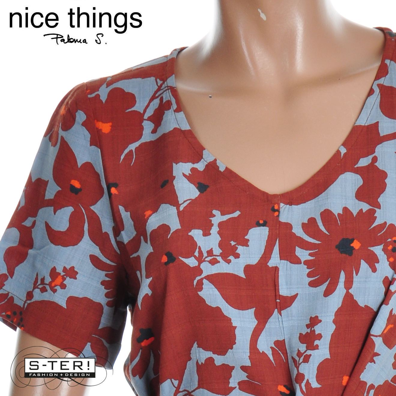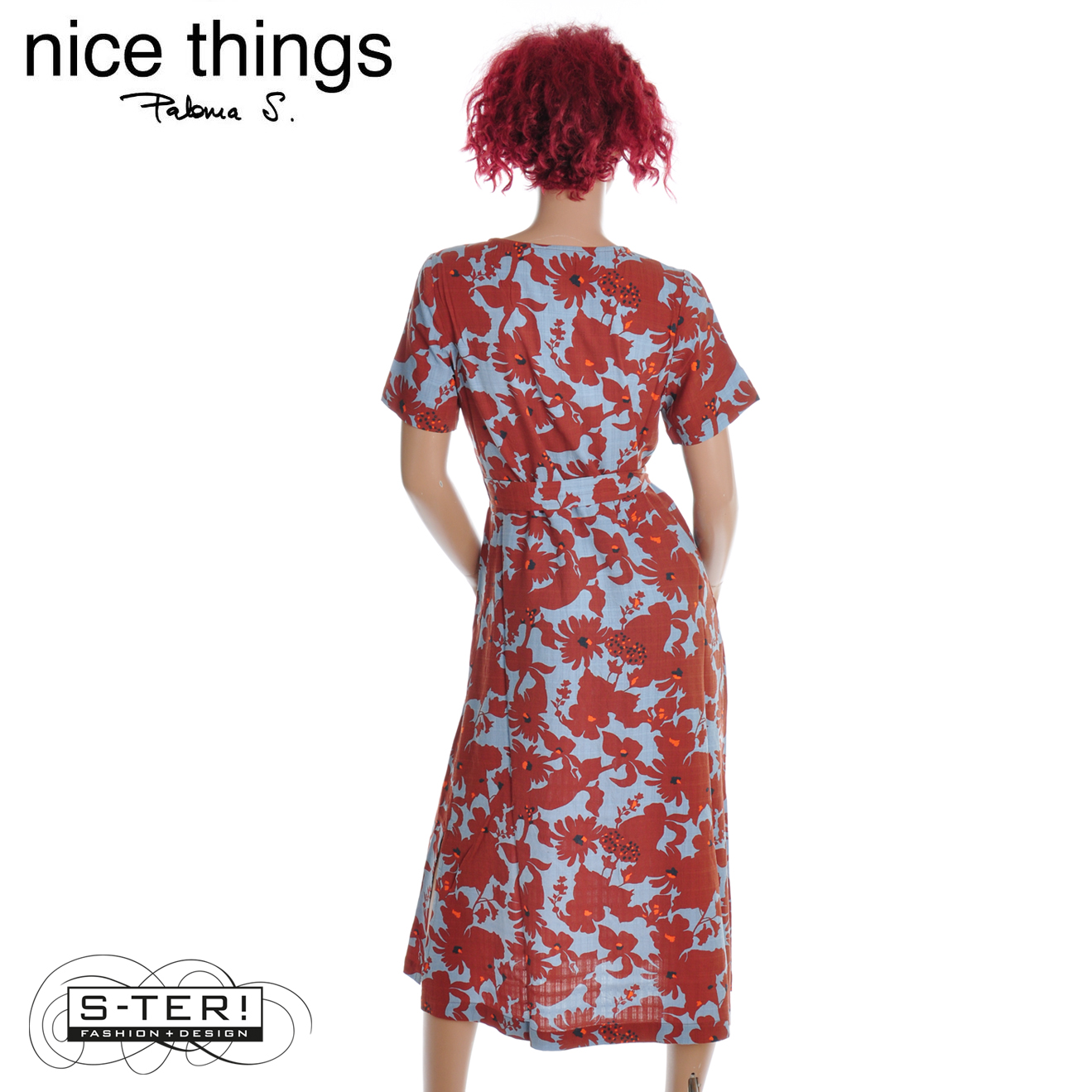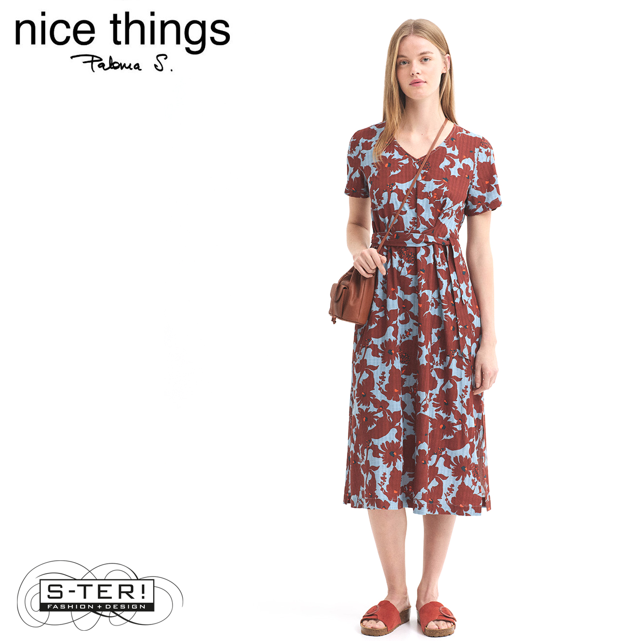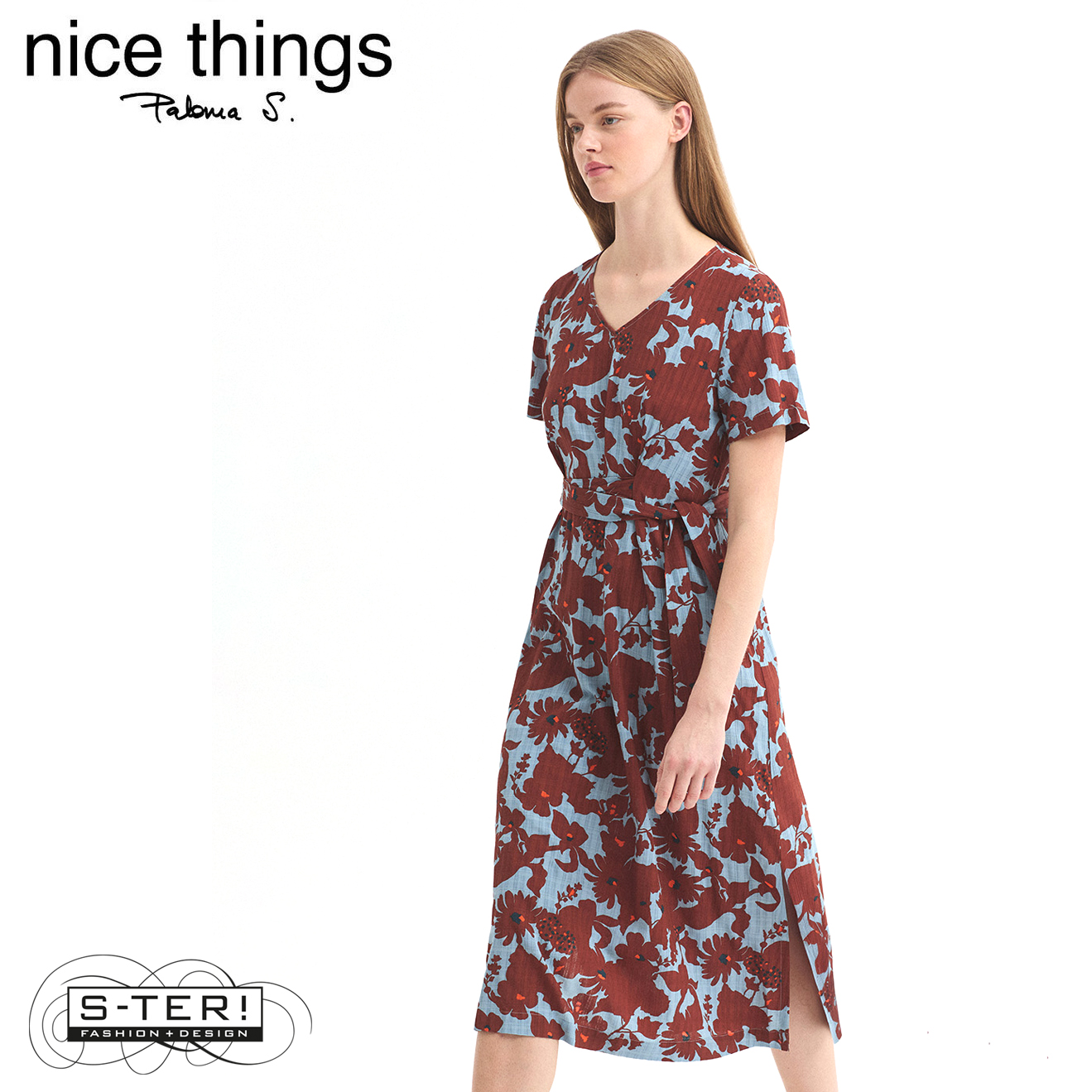 Nice Things komt uit Spanje en is echt een mooi merk met eigen handtekening. Dit mooie jurkje van geweven viscose heeft een V hals en korte mouwtjes en kun je aansnoeren op de rug met een strikband.