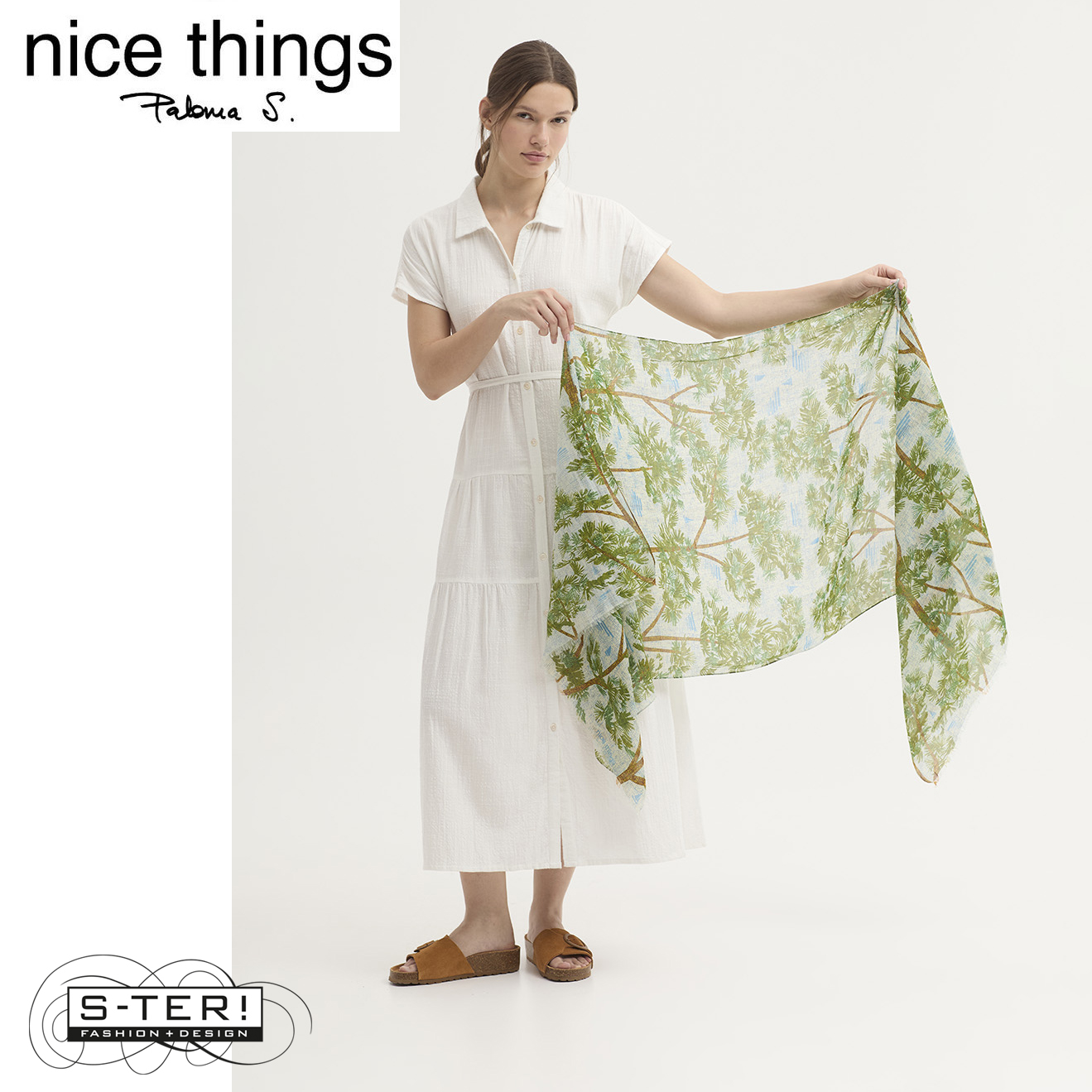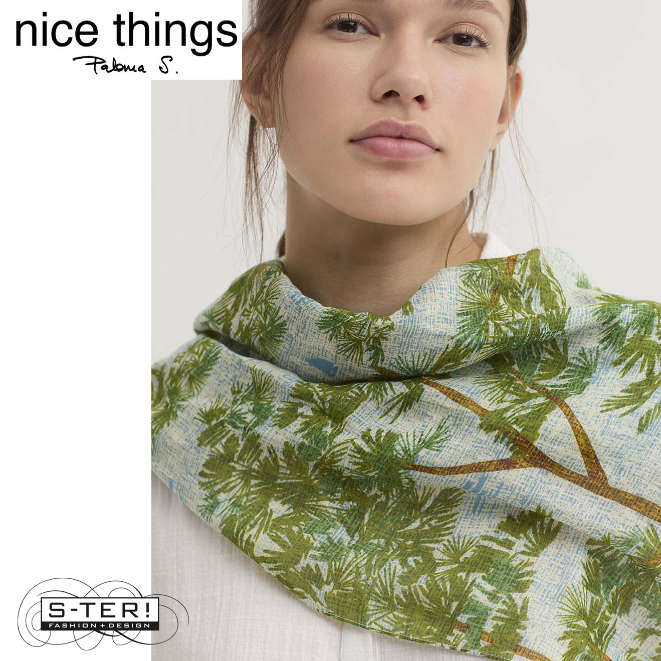 Nice Things komt uit Spanje en is echt een mooi merk met eigen handtekening. Deze fijne shawl is heerlijk zacht want hij is gemaakt van katoen-zijde en heeft een prachtige pijnbomen print die past bij de collectie.