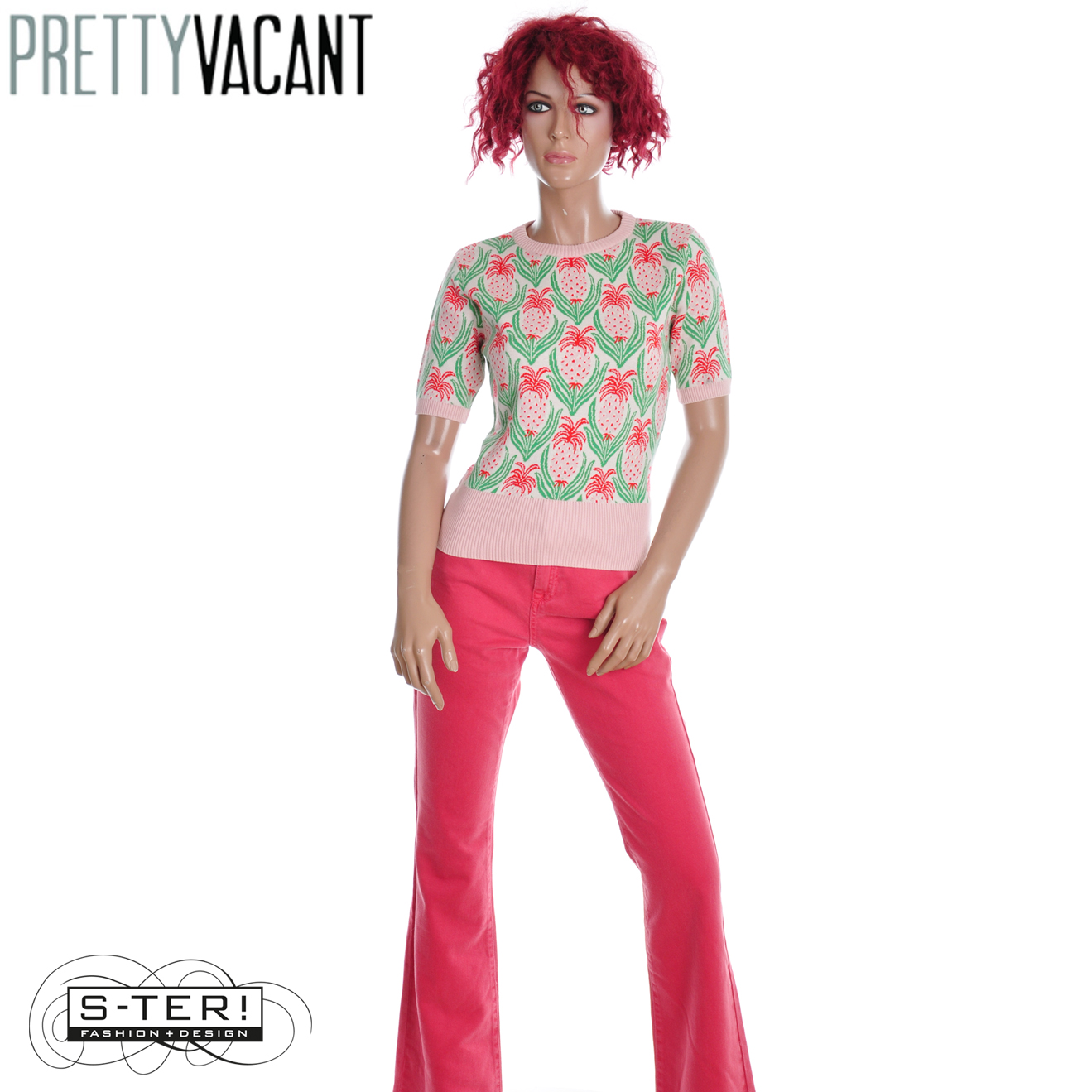 Pretty Vacant is nieuw bij ons en komt uit Engeland en is een duurzaam merk met een echt 50’s gevoel. Dit leuke truitje heeft een ronde hals, korte mouwtjes en pineapple patroon. Het is gemaakt van zachte bio katoen. De maten vallen vooral bij de kleinere maten redelijk ruim.